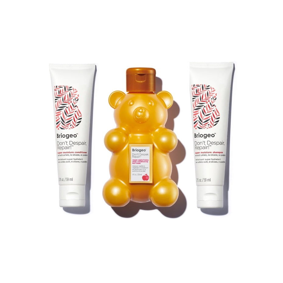 A kit featuring a hair mask proven to boost moisture up to 88 percent after just two uses plus a travel-size bestselling repair shampoo and conditioner duo. This mask helps decrease hair breakage, making it softer after as few as two uses. It is powered by a Vegan Apple Honey Complex, an animal-friendly alternative to honey, and rosehip oil that deeply hydrates and nourishes dry hair, plus B-vitamins and algae extract to help strengthen hair.