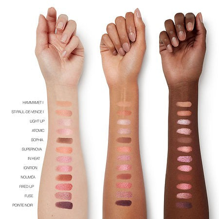 - 12 x 0.04 oz/ 1.4 g Eyeshadows in Hammamet (matte beige), St-Paul-De-Vence (shimmering nectarine), Light Up (sparkling pink pearl), Atomic (sparkling bubblegum pink), Sophia (matte rich cool brown), Supernova (metallic coral with pink), In Heat (sparkling magenta), Ignition (sparkling rose), Nouméa (matte sienna), Fired Up (metallic rust), Fuse (sparkling purple with blue), Ponte Noir (sparkling eggplant with pink)