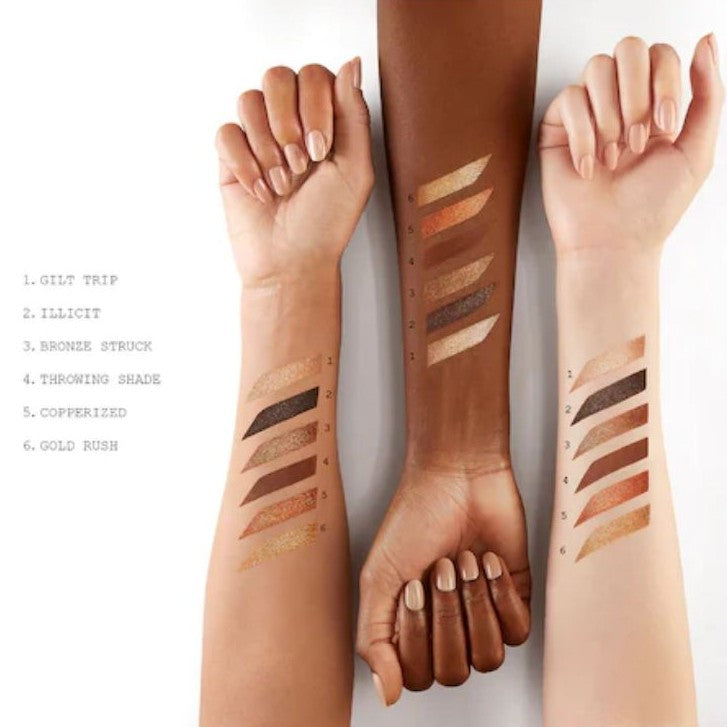 Revel in a legendary gilt trip of iconic illumination, captured in a sexy soiree of fiery coppers, illicit charcoals, a rush of sensual golds, and carnal champagnes. Six impassioned shades evoke the ultimate in erotic elegance, draping the eyes in arousingly smooth formulations that glide on effortlessly and exhibit flawless, timeless grandeur. Luxurious and uninhibited, this sublime array of textures and finishes slays with style and splendour.