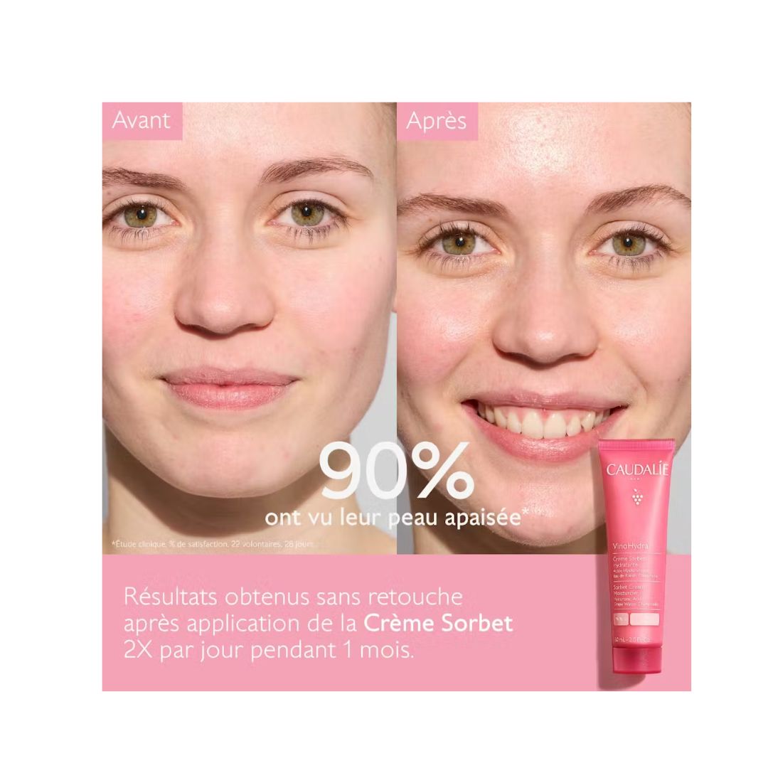 The patented grape seed polyphenols fight wrinkle-causing free radicals like pollution, stress, and sun damage. Sorbet is also is rich in Vinolevure, which strengthens skin, making it less sensitive and more resilient over time. These precious ingredients provide the perfect recipe for baby soft, bouncy skin. When applied, feel the texture melt from a cream to a water-like gel upon contact. This "quick break" technology is the lipophilic technology that allows water to be trapped in the cream, and once the cream touches the skin, it releases the water for lightweight hydration. Vinotherapie spa tip: store in the fridge for a refreshing burst of cool moisture.